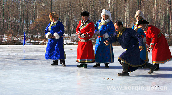 冰上阿日嘎,是蒙古族传统的冰上体育运动。阿日嘎特指经过加工修理的牛、骆驼和马鹿的踝骨。制作阿日嘎的这些踝骨,去掉肉皮和油垢,把凸面和凹面削平;在凸面打个洞,灌进铅水以增加重量。在冰上游戏时,凸面向上抓阿日嘎,用大拇指和食指捻弹向远方,当作目标阿日嘎。另外一个阿日嘎,瞄准目标阿日嘎捻弹过去,击中者算取得胜利。比赛结果,败家要输给赢家绵羊和山羊的踝骨。关于这项游戏,《蒙古秘史》和《满都海斯琴》等史书都有所记载。竞争激烈并情趣盎然的这项体育运动,富有鲜明的民族风格和地方特色,还具有民族学、体育运动学和草原文化学等方面的价值。
