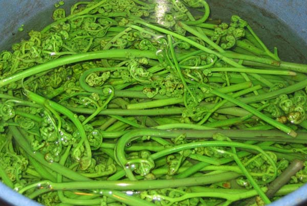 蕨菜有“山菜之王"的美称,又称佛手菜。端午节前后生于深山老林之中,初出穗时如佛手,茎若蒜苔,日长10多公分,30公分后即纤维化,不能食用。出土两三天后即老化,生长速度极快。采摘后马上要进行处理,否则采时嫩若鲜藕,几小时后根部即老化,一日之内所剩无几。蕨菜有去热、利尿、去毒等药效,营养极为丰富。
