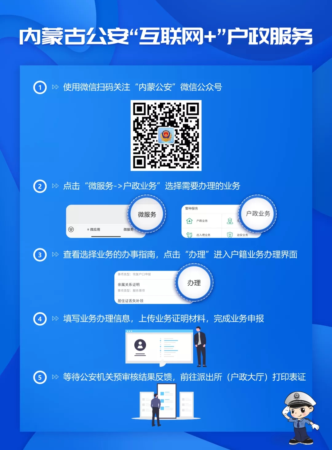 为方便广大人民群众办理户籍业务,本着通过互联网实现“让数据多跑路,让群众少跑腿”的工作目标,内蒙古公安厅推出内蒙公安“互联网+”便民服务平台,阿旗公安局目前同步上线试运行。3月31日起,户口申报、注销、迁移、变更更正等85项户籍业务可通过平台线上申请办理。