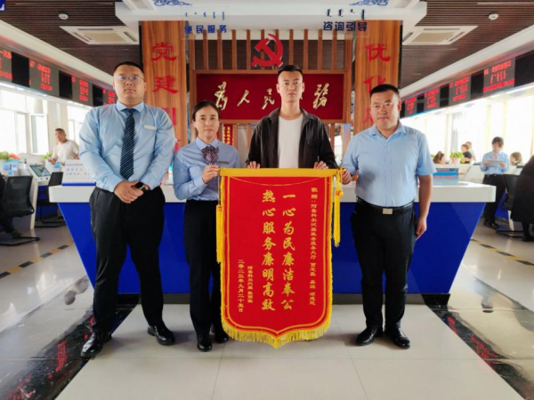 2023年9月25日,一面写有“一心为民廉洁奉公,热心服务廉明高效”的锦旗送到阿鲁科尔沁旗政务服务大厅吴经理手中。办事群众以最淳朴、最真挚的感情,对工作人员“廉洁、高效、为民”的服务表示由衷地感谢。